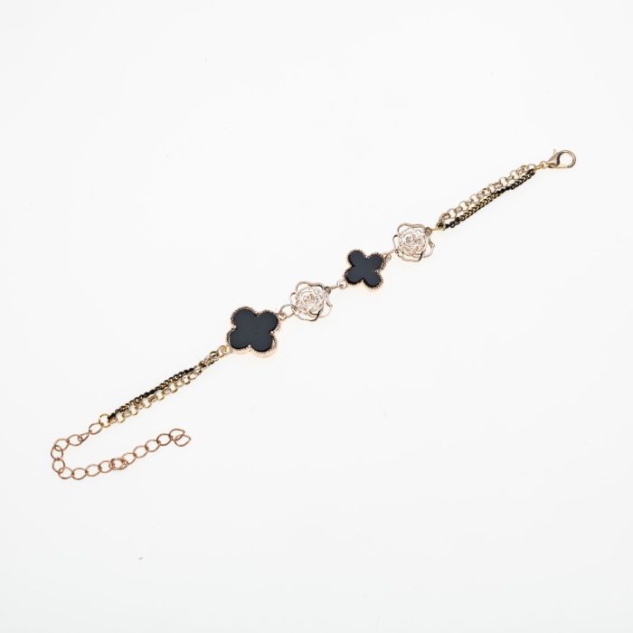 - Διαχρονικά Μοτίβα: Τα κομψά μαύρα λουλούδια (που θυμίζουν τετράφυλλα τριφύλλια) και οι λεπτεπίλεπτες ροζέτες αποτελούν διαχρονικά σύμβολα ομορφιάς και θηλυκότητας, προσδίδοντας ένα κλασικό άρωμα στο βραχιόλι.