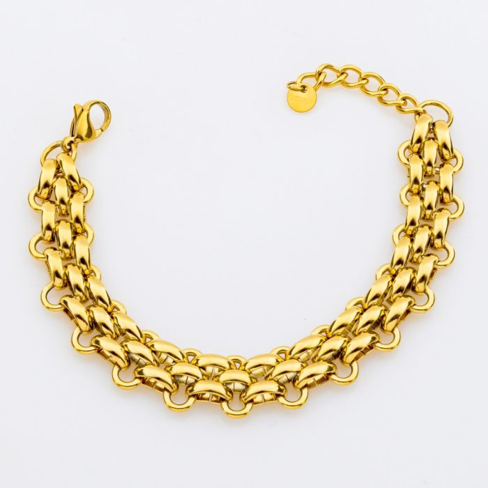<p>Για τη γυναίκα που επιθυμεί να ξεχωρίζει και να εκπέμπει αυτοπεποίθηση, αυτό το χρυσό βραχιόλι είναι το ιδανικό κόσμημα. Ο μοναδικός του σχεδιασμός με τρεις πλούσιες σειρές αλληλοσυνδεόμενων κρίκων δημιουργεί ένα εντυπωσιακό οπτικό αποτέλεσμα, προσδίδοντας βάθος και φινέτσα σε κάθε σας εμφάνιση. Φτιαγμένο από μέταλλο, συνδυάζει την αισθητική πολυτέλεια με την απαραίτητη ανθεκτικότητα για την καθημερινότητα.</p>