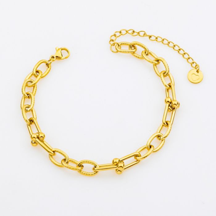 Αναδείξτε το στυλ σας με ένα χρυσό βραχιόλι που ξεχωρίζει! Ο μοντέρνος σχεδιασμός του, με εναλλασσόμενους ανάγλυφους οβάλ και γεωμετρικούς κρίκους, προσφέρει μια εκλεπτυσμένη και δυναμική πινελιά. Κατασκευασμένο από ανθεκτικό ανοξείδωτο ατσάλι, είναι το ιδανικό αξεσουάρ για τη γυναίκα που επιθυμεί λάμψη, ποιότητα και ένα αξεπέραστο στυλ σε κάθε της εμφάνιση.