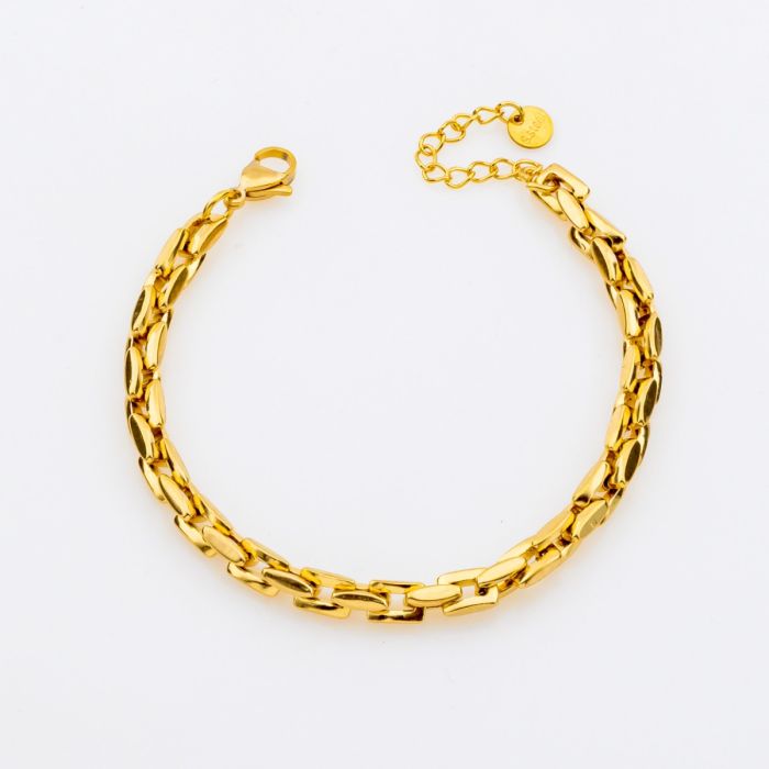 Αναβαθμίστε την εμφάνισή σας με ένα χρυσό βραχιόλι που αποπνέει σύγχρονη κομψότητα. Ο ιδιαίτερος σχεδιασμός με επίπεδους, οβάλ κρίκους δημιουργεί ένα μοναδικό μοτίβο που αγκαλιάζει τον καρπό με λάμψη. Κατασκευασμένο από ανοξείδωτο ατσάλι, είναι το ιδανικό αξεσουάρ για κάθε γυναίκα που αναζητά διαχρονικό στυλ και ανθεκτικότητα.