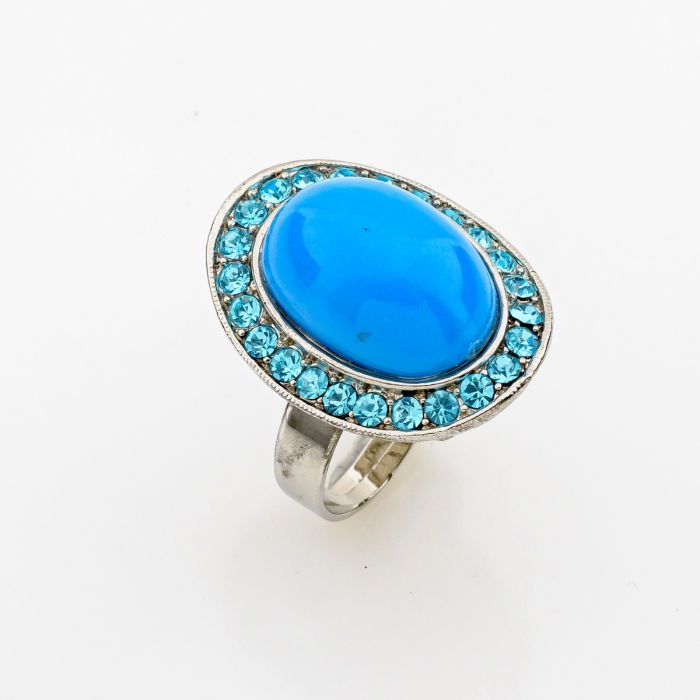 Description / Δαχτυλίδι μεταλλικό σε ασημί χρώμα,οβάλ με μεγάλη γαλάζια πέτρα και στράς