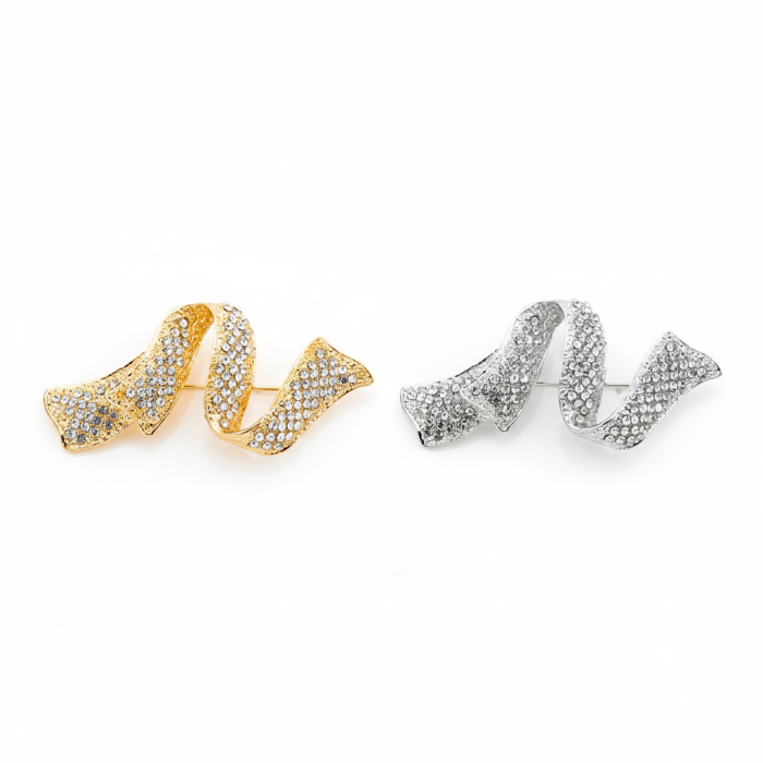 Προσθέστε μια πινελιά αριστοκρατικής λάμψης στο στυλ σας με μια εντυπωσιακή καρφίτσα σε σπειροειδές σχέδιο κορδέλας, διακοσμημένη με αστραφτερά στρασάκια. Διαθέσιμη σε λαμπερό χρυσό ή εκλεπτυσμένο ασημί τόνο, είναι το ιδανικό αξεσουάρ για να αναδείξετε κάθε σύνολο, προσφέροντας μια αίσθηση πολυτέλειας και φινέτσας.