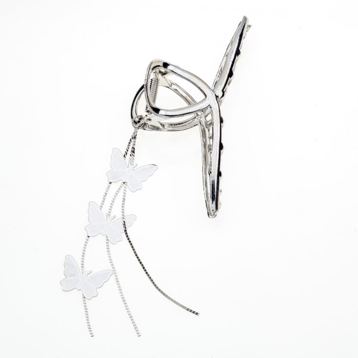 Αφήστε τη φινέτσα να αγκαλιάσει τα μαλλιά σας με αυτό το υπέροχο μεταλλικό κλάμερ, στολισμένο με λεπτοδουλεμένες πεταλούδες. Η μεταλλική του λάμψη, σε συνδυασμό με το ρομαντικό μοτίβο των πεταλούδων, δημιουργεί ένα αξεσουάρ που αποπνέει πολυτέλεια και κομψότητα. Είναι ιδανικό για τη γυναίκα που θέλει να ξεχωρίζει, προσθέτοντας μια διακριτική αλλά εντυπωσιακή πινελιά στο στυλ της.