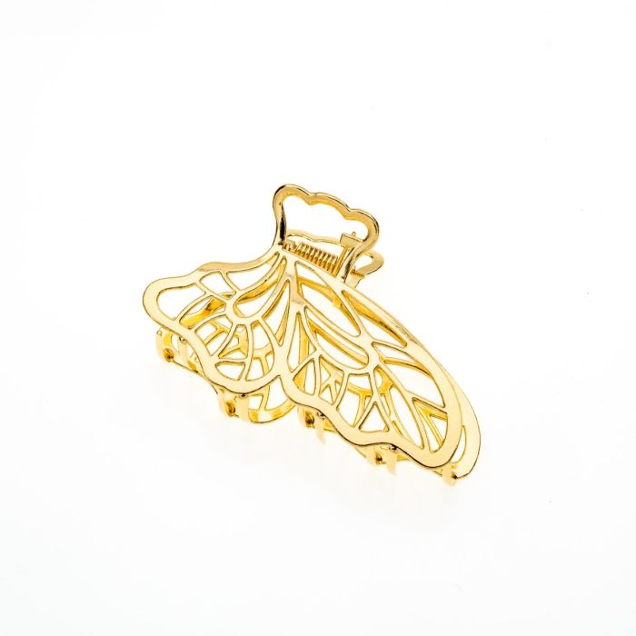 Αυτό το κλάμερ, με το κεντρικό του μοτίβο σε σχήμα πεταλούδας, είναι ένα αληθινό κόσμημα για τα μαλλιά σας. Σχεδιασμένο να αποπνέει φινέτσα και ρομαντισμό, αγκαλιάζει τα μαλλιά σας με τη χάρη ενός φτερούγισμα. Η μεταλλική του υφή, διαθέσιμη σε λαμπερό χρυσό και κομψό ασήμι, το καθιστά ένα ευέλικτο αξεσουάρ που ταιριάζει σε κάθε περίσταση, από την καθημερινότητα μέχρι τις πιο επίσημες εκδηλώσεις.