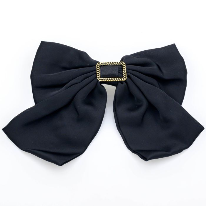 Αναδείξτε το στυλ σας με αυτή την πολυτελή μαύρη μπαρέτα φιόγκο. Με μια εντυπωσιακή χρυσή αγκράφα αλυσίδας, προσδίδει διαχρονική κομψότητα και λάμψη, μετατρέποντας κάθε χτένισμα σε μια statement επιλογή.
