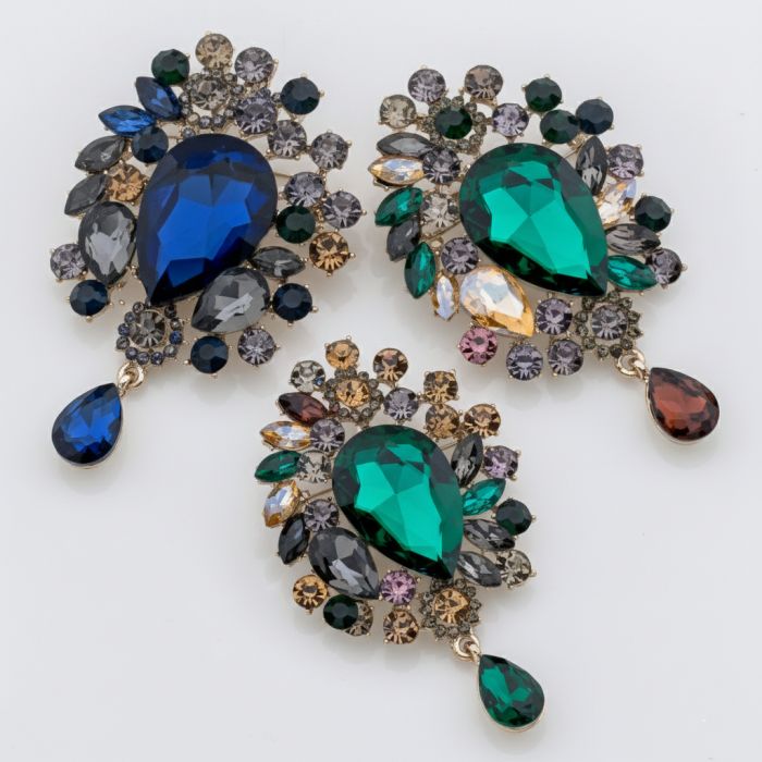 Πολυτελή καρφίτσα με πολύχρωμες πέτρες και ένα κρεμαστό σταγόνας.