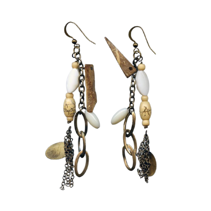 Description / Σκουλαρίκια μεταλλικά διακοσμημένα με μεταλλικές,ξύλινες,πλαστικές λεπτομέρειες