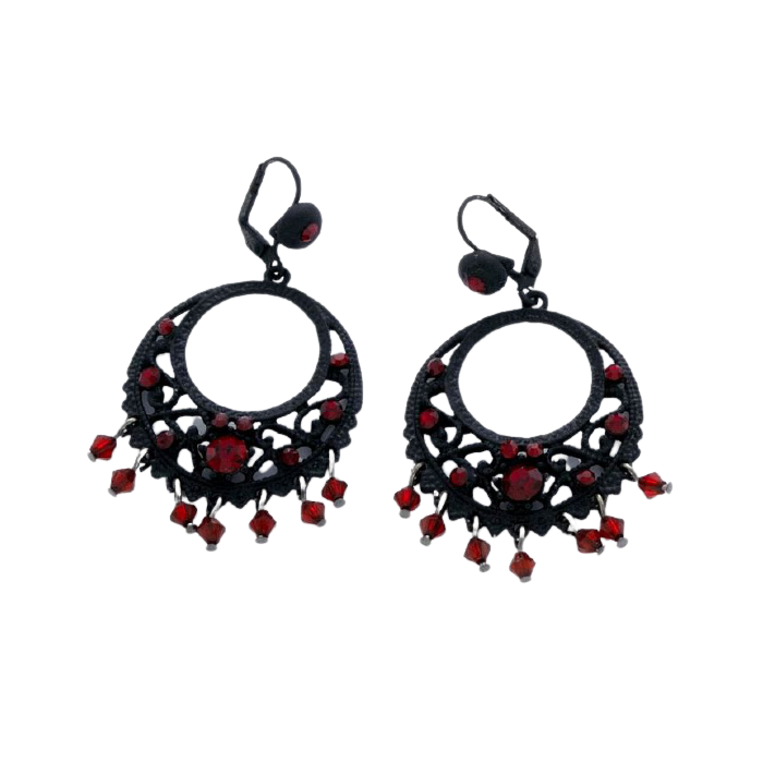 Σκουλαρίκια μεταλλικά διάτρητα σε μαύρο χρώμα διακοσμημένα με κόκκινες χάντρες