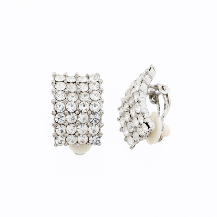 Μεταλλικά σκουλαρίκια με λευκά στράς, τύπου κλιπ, σε ασημί χρώμα. Ιδανικά για καθημερινές ή βραδινές εμφανίσεις, προσφέροντας κομψότητα και λάμψη.