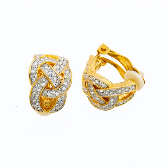 Σκουλαρίκια μεταλλικά σε χρυσό χρώμα και περίτεχνο σχέδιο με κλίπ διακοσμημένα με λευκά στράς