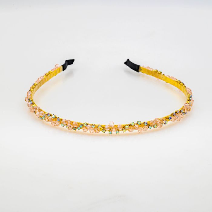 Αγκαλιάστε την εσωτερική σας πριγκίπισσα με μια πινελιά αιθέριας λάμψης. Αυτή η εκθαμβωτική στέκα-κόσμημα, πλεγμένη με ροζ κρύσταλλα και ιριδίζουσες πέτρες σε χρυσή βάση, είναι η απόλυτη επιλογή για τις πιο ξεχωριστές στιγμές σας.
