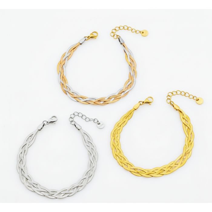 <p>Φανταστείτε τον εαυτό σας να ακτινοβολεί, καθώς αυτό το εκλεπτυσμένο βραχιόλι αγκαλιάζει τον καρπό σας με την απαλή του λάμψη. Ο περίτεχνος πλεκτός σχεδιασμός, εμπνευσμένος από την κίνηση ενός φιδιού, προσφέρει μια μοναδική υφή και αισθητική που ξεφεύγει από τα συνηθισμένα. Είτε επιλέξετε την κλασική γοητεία του χρυσού ή του ασημιού, είτε την τολμηρή αρμονία του τρικολόρε, αυτό το βραχιόλι δεν είναι απλώς ένα κόσμημα – είναι μια επένδυση στην αυτοπεποίθηση και το στυλ σας, ένα κομμάτι που θα σας συντροφεύει σε κάθε ξεχωριστή στιγμή.</p>